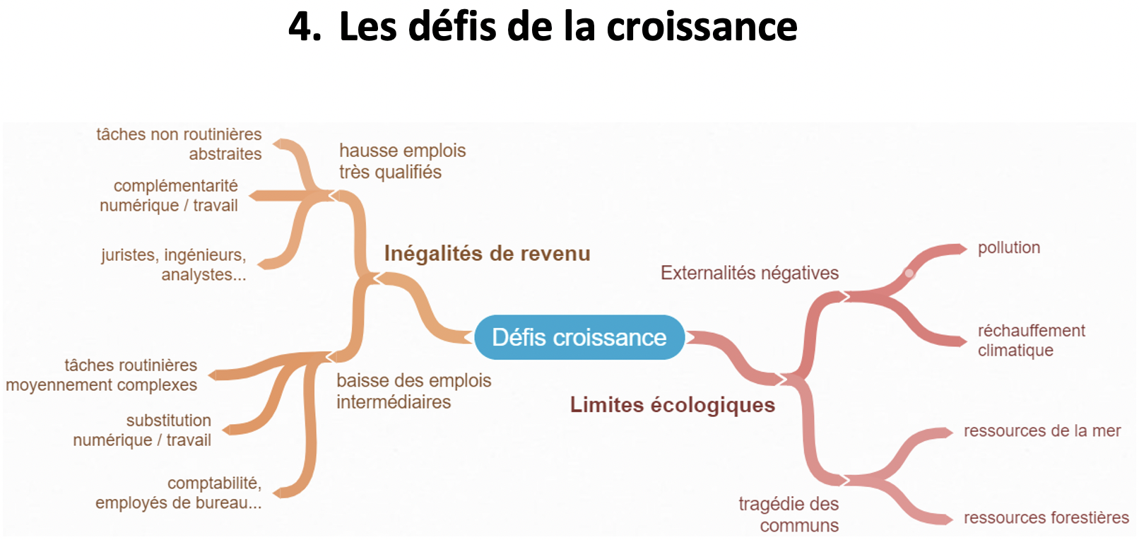 La croissance se heurte à des limites écologiques (par exemple, l’épuisement des ressources naturelles, ainsi qu’à des problèmes de répartition (qui génèrent des inégalités entre individus).
